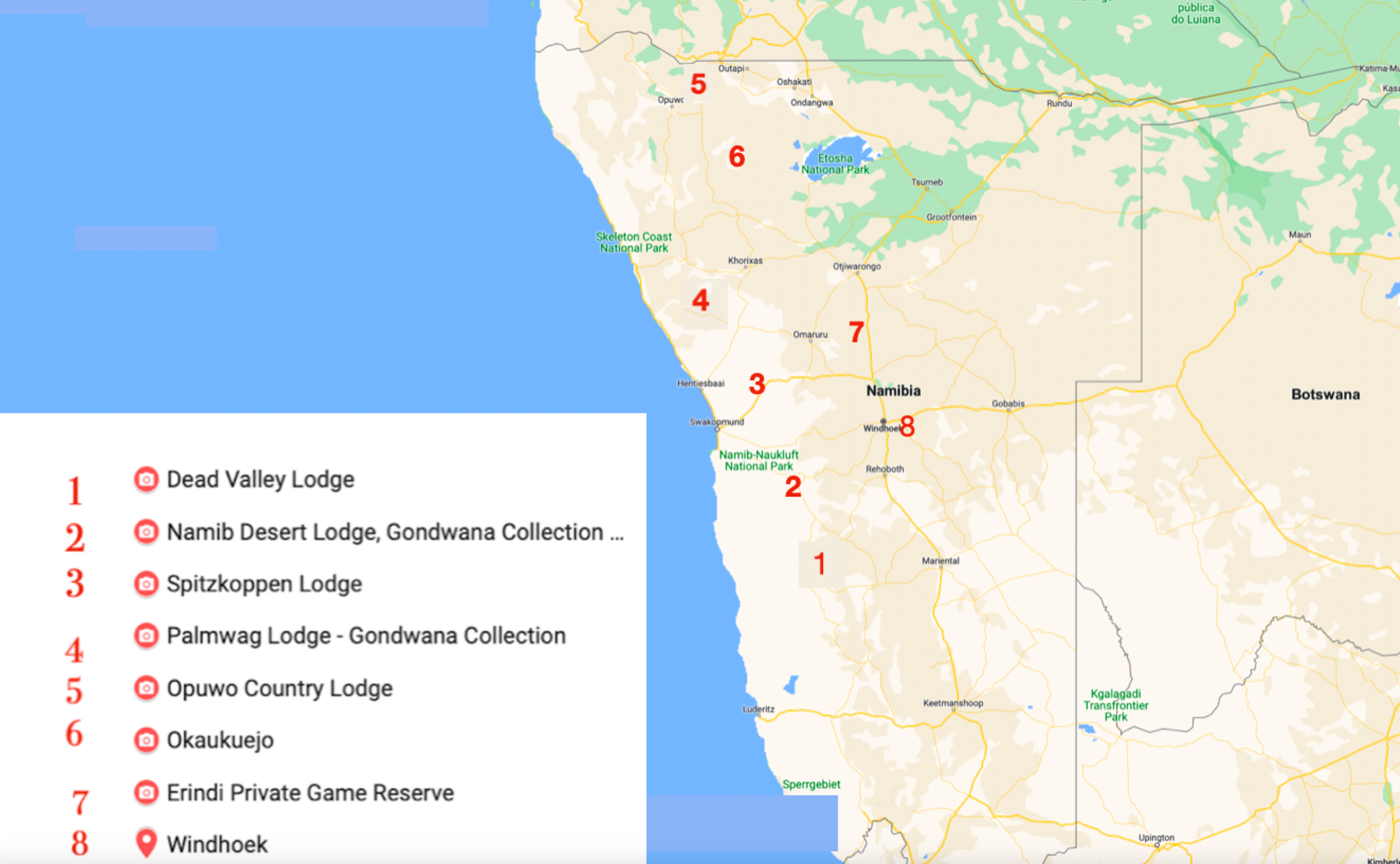 Our workshop began in Windhoek, the capital of Namibia. The Hilton Hotel in Windhoek is a great place to stay on your first and last nights in Namibia. In the map below, you can see the route that we took on our 12-day trip. Namibia is a huge country, so there are plenty of locations that we were not able to reach (i.e., Skeleton Coast). However, we were able to see a fantastic mix of fabulous landscapes, people in the Himba Villages, and, of course, wildlife.