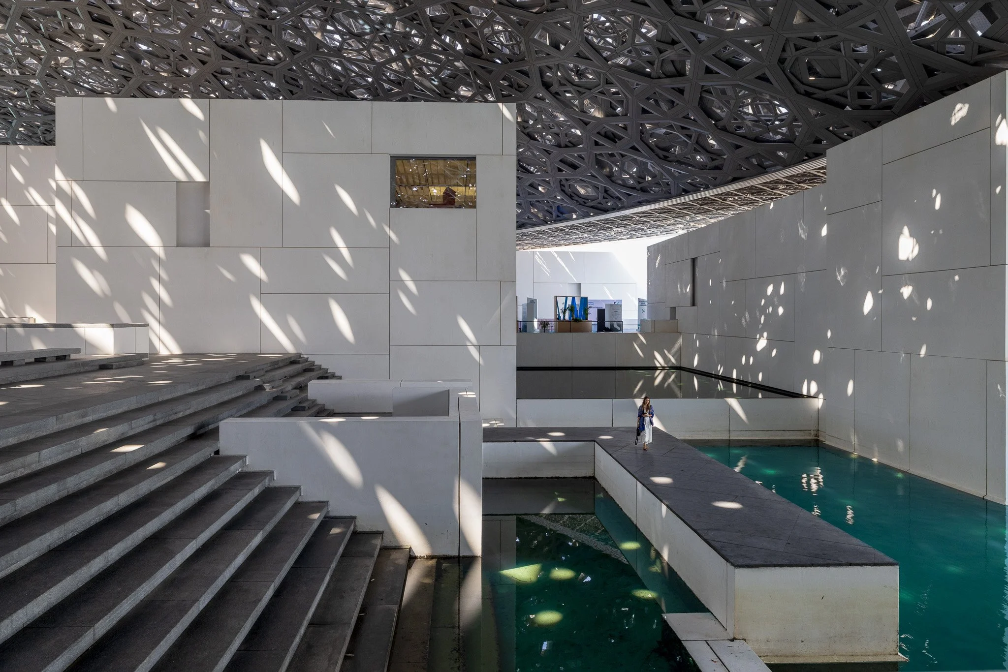 Modern architectural interior with white walls, black steps, water feature, and a hammered metal ceiling casting patterned shadows, with a person walking on a dark pathway.