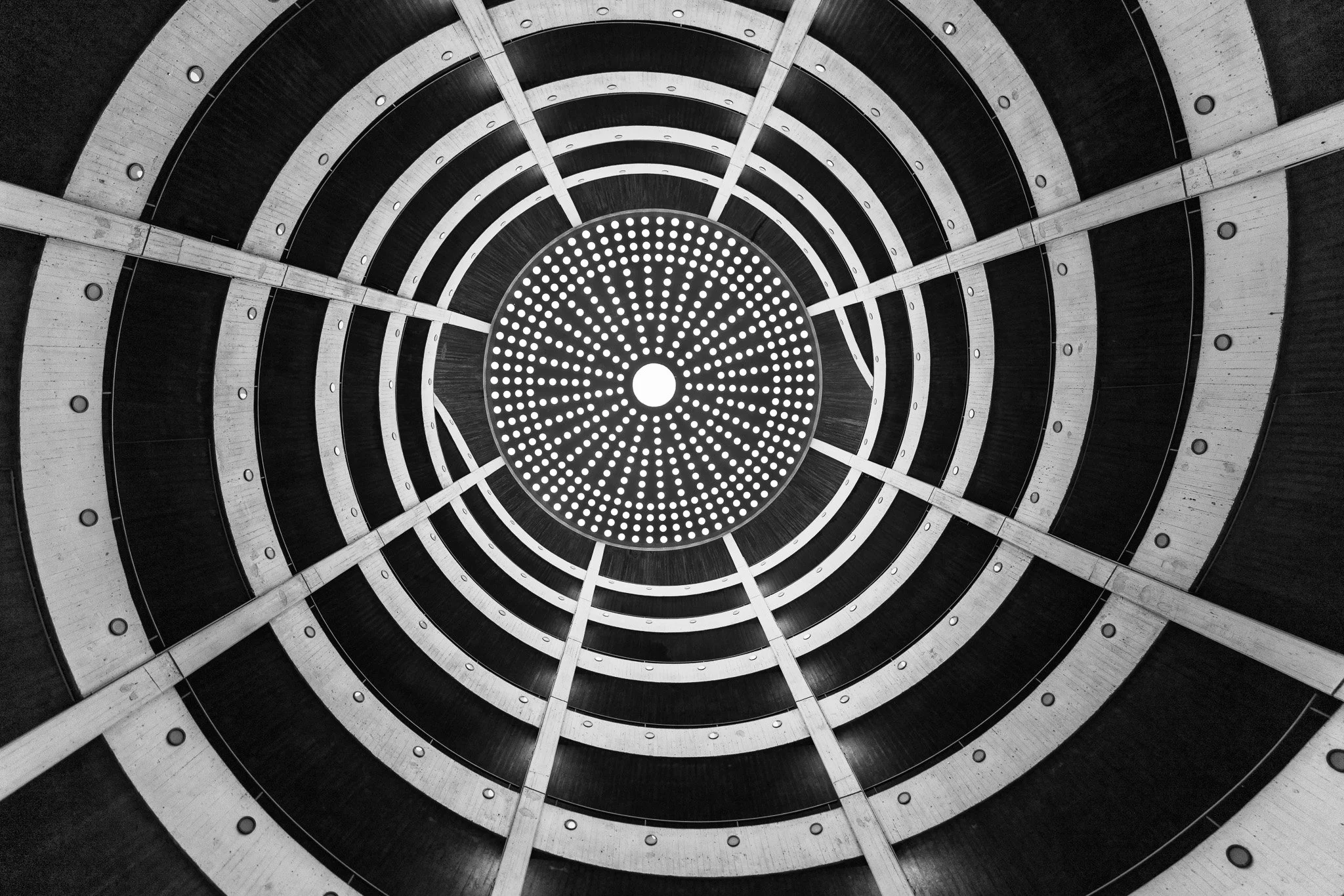 Looking up inside a multi-level circular parking garage with a central light fixture at the top, viewed from the ground floor.