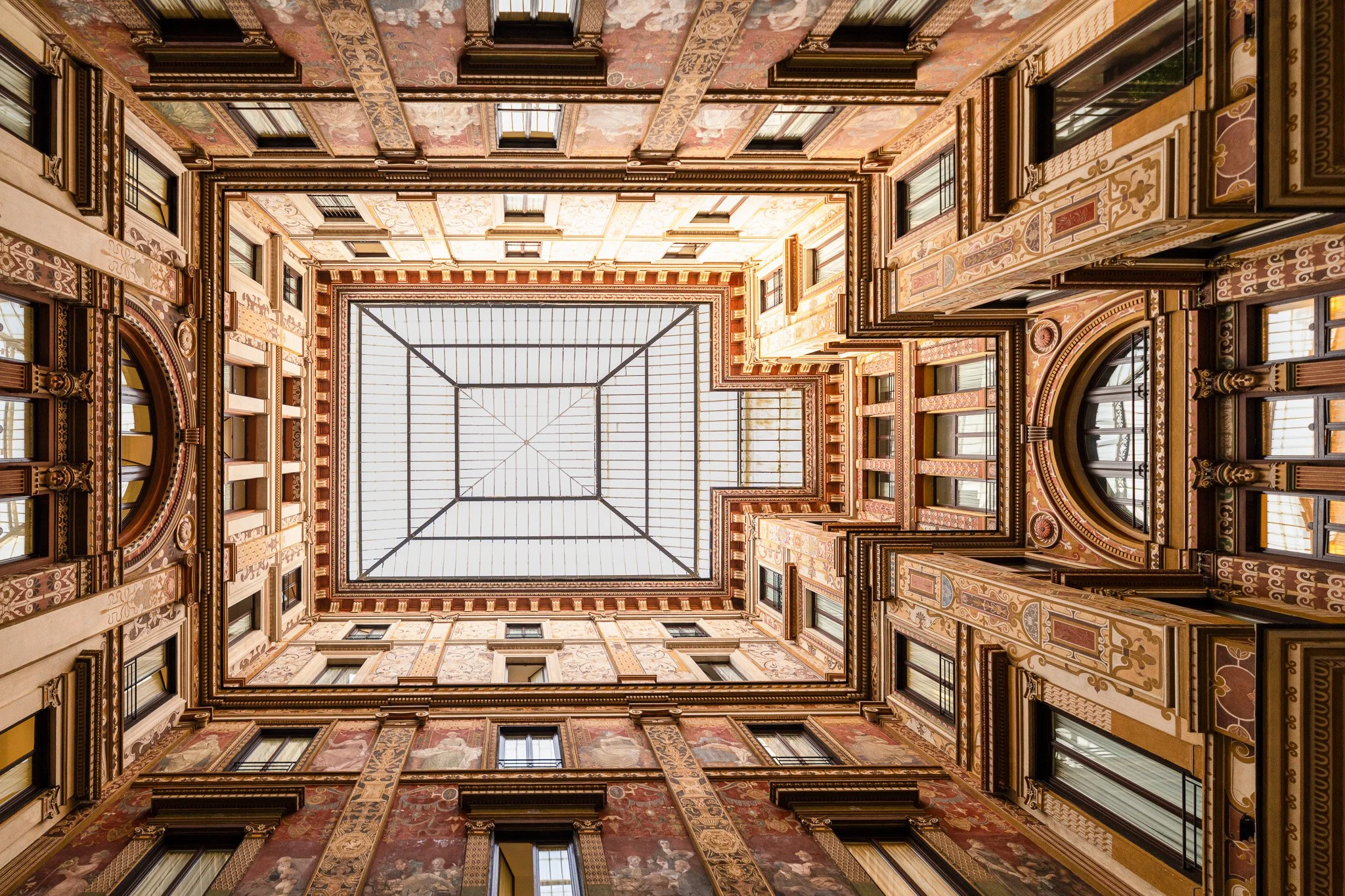 Interior view of an ornate building courtyard from below, showcasing detailed architectural decorations on all sides and a glass ceiling with geometric framing.