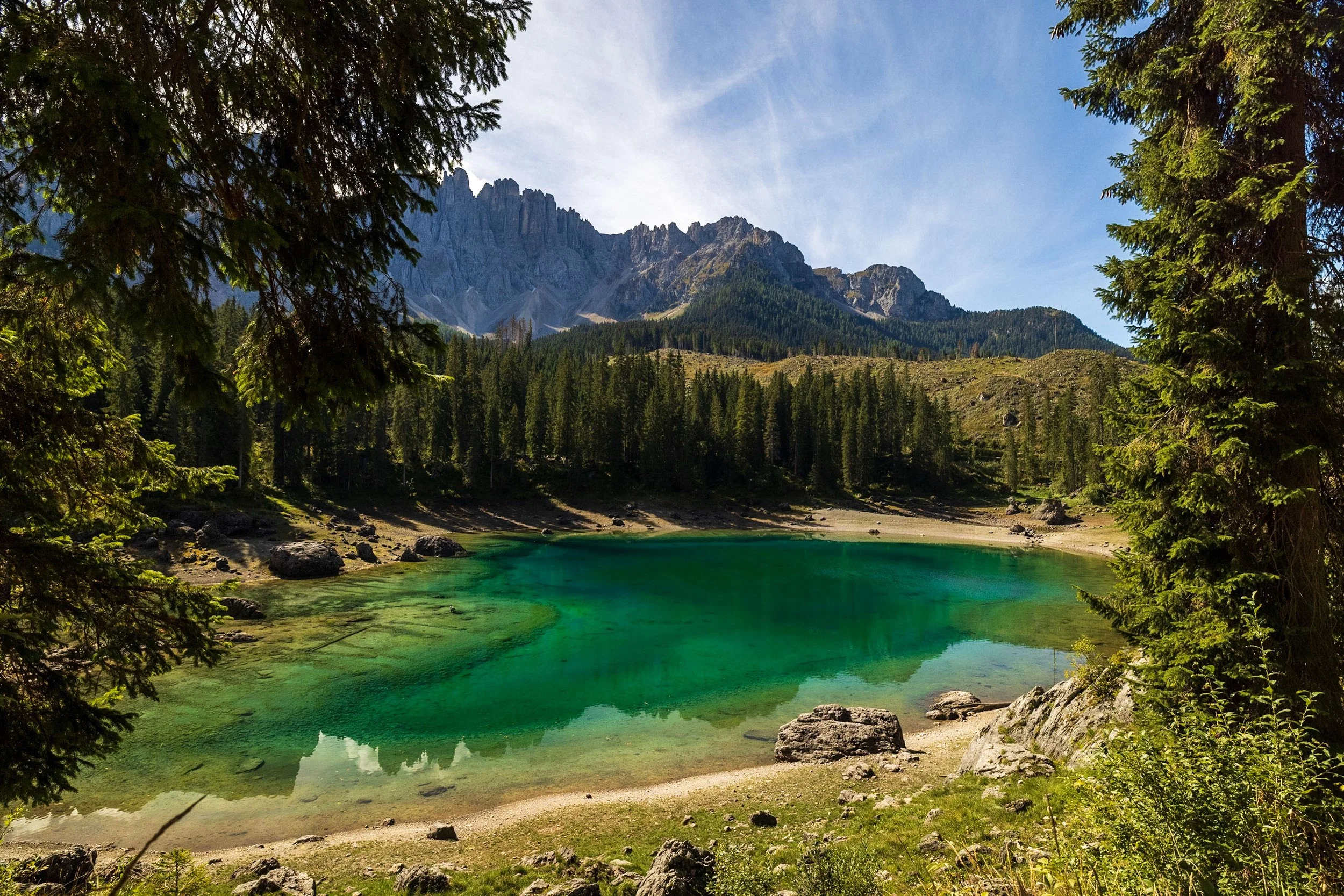 Lago di Carezza (also known as Karesee) is another striking body of water in the Dolomites. Although smaller than Lago di Braies its emerald shimmer is even more magical as it appears to transform before the eyes.