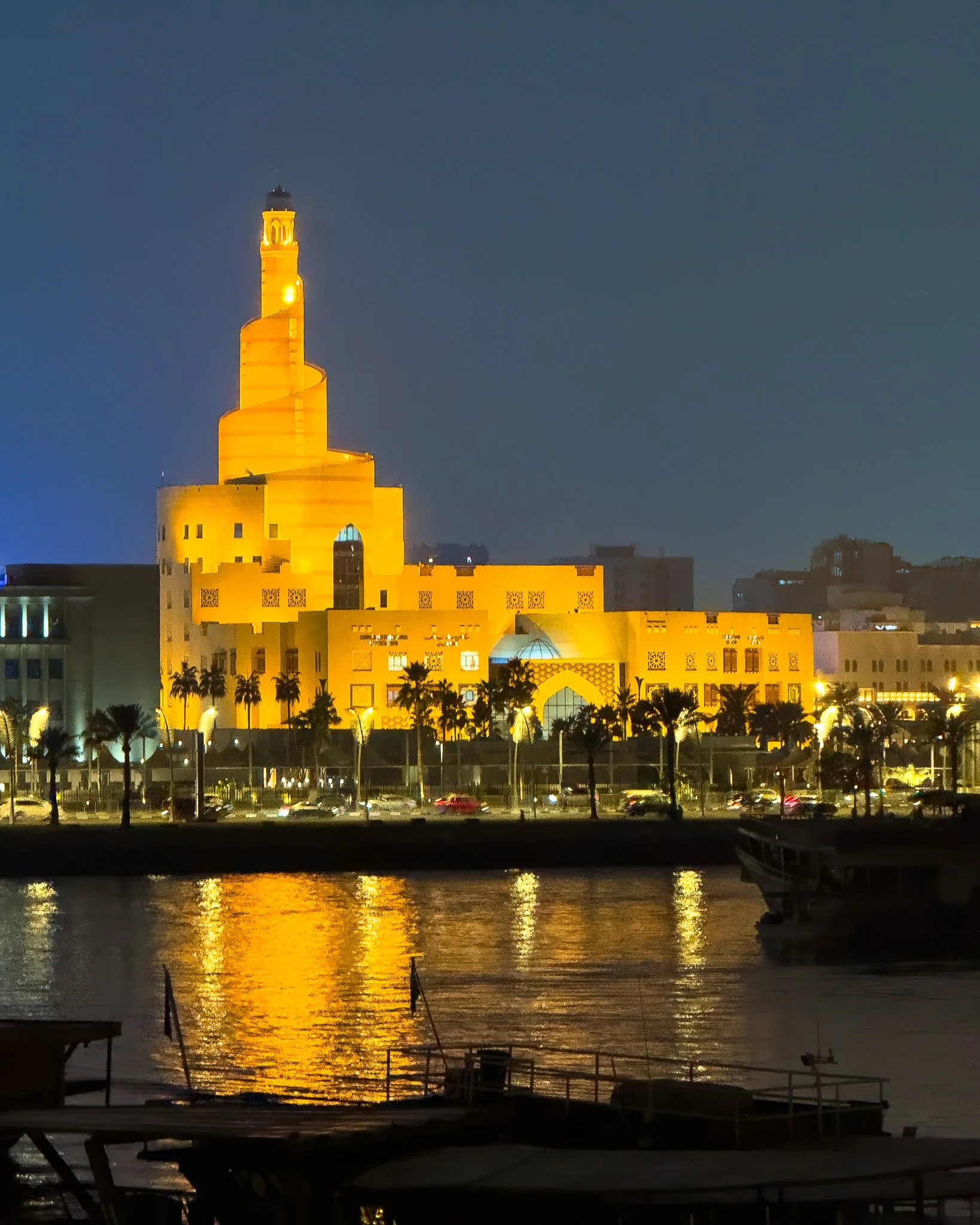 Golden hour in Doha is short but dramatic, with warm light reflecting off limestone and glass.