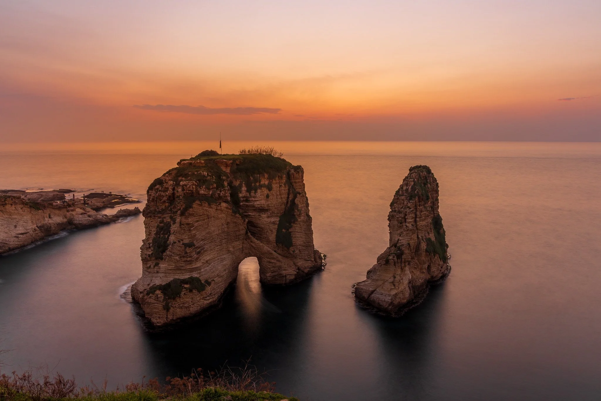 The iconic Pigeon Rocks rise dramatically from the Mediterranean just off the coast of Beirut in the Raouché district.