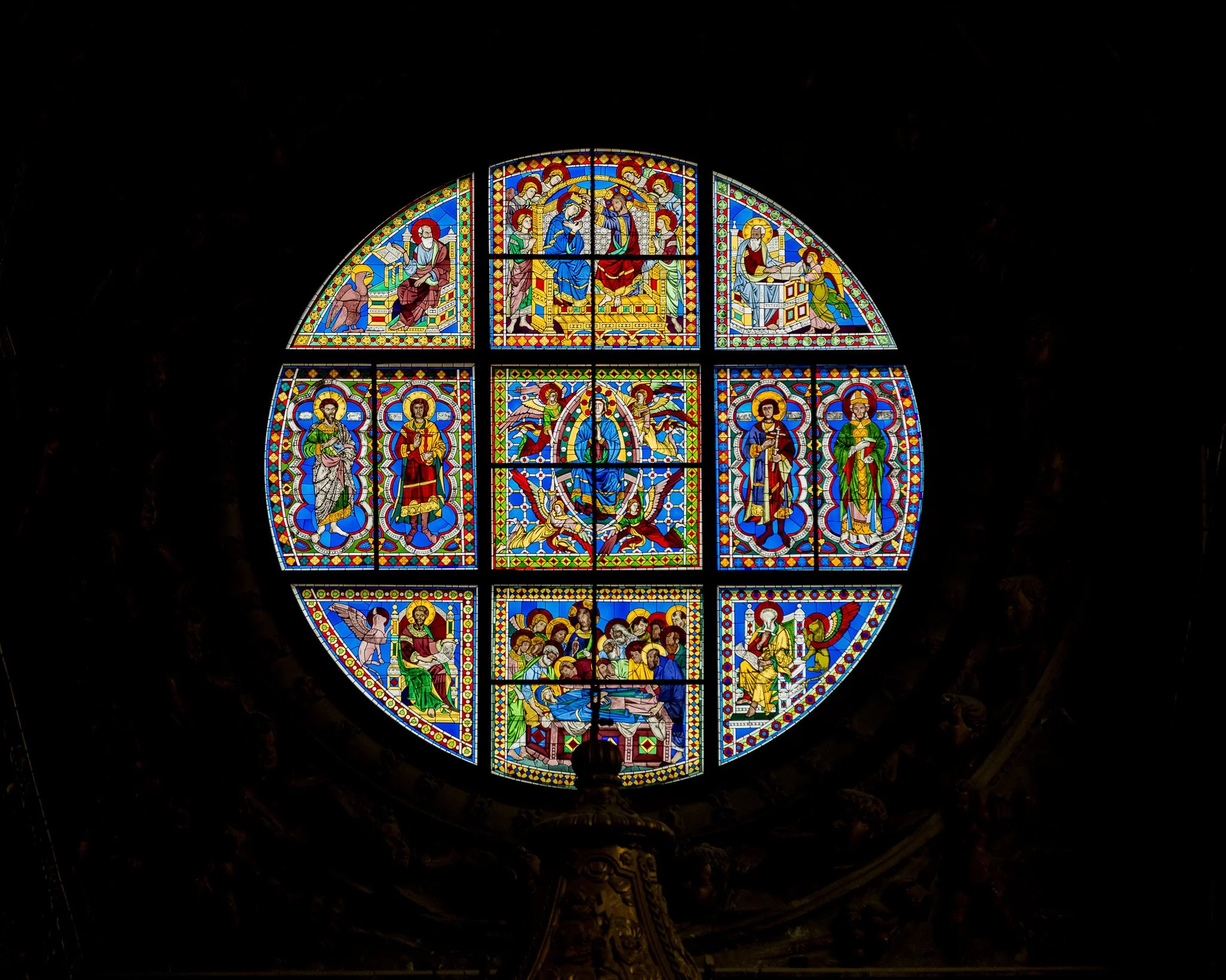 The most notable stained glass window is the rose window located in the apse, behind the high altar. This window was designed by Duccio di Buoninsegna, one of the most important painters of the 14th century.