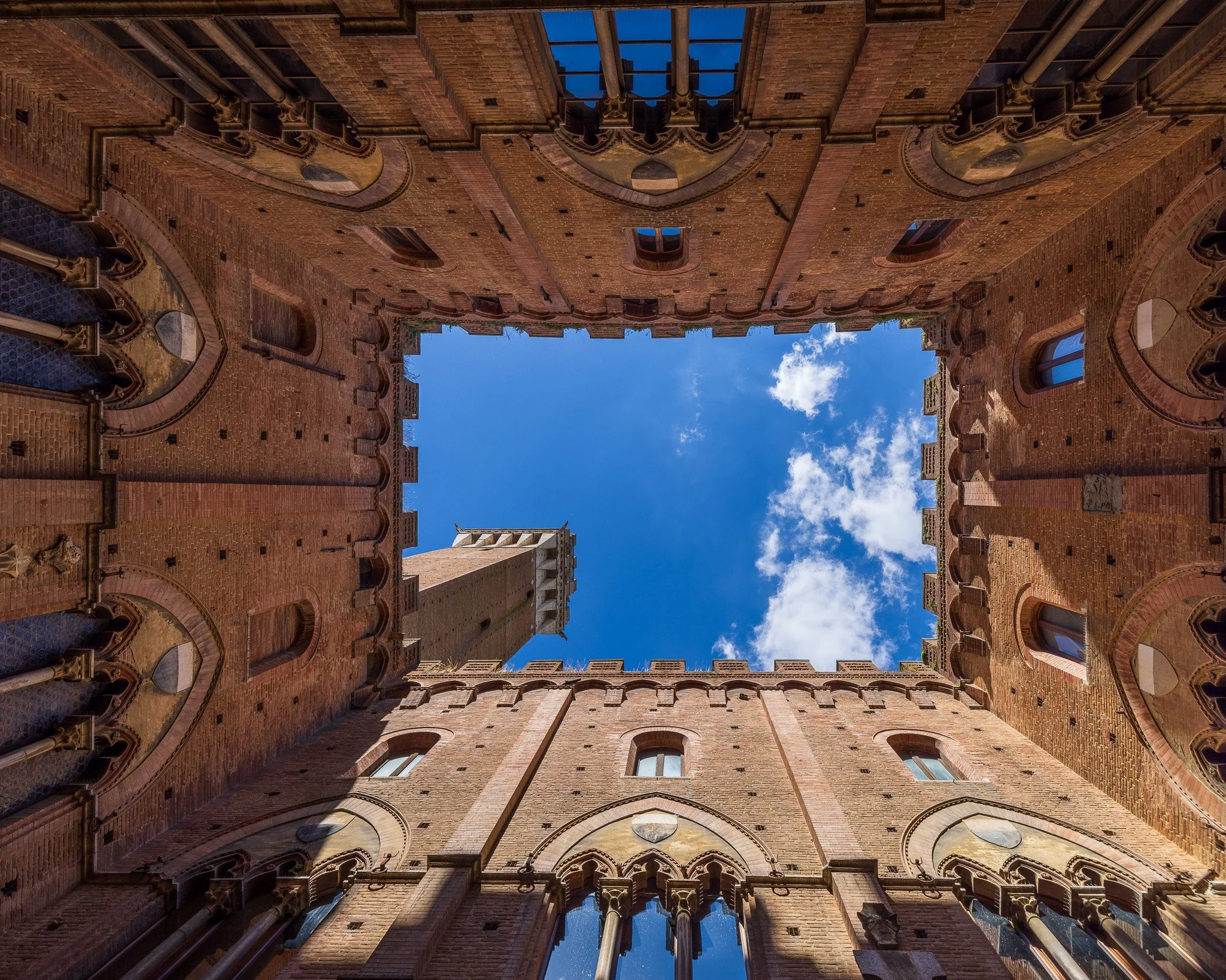View of the Torre del Mangia (Piazza del Campo, Siena) from the courtyard. The courtyard's entrance is free, and you can visit it at night as well. You will need a wide-angle lens to capture it.