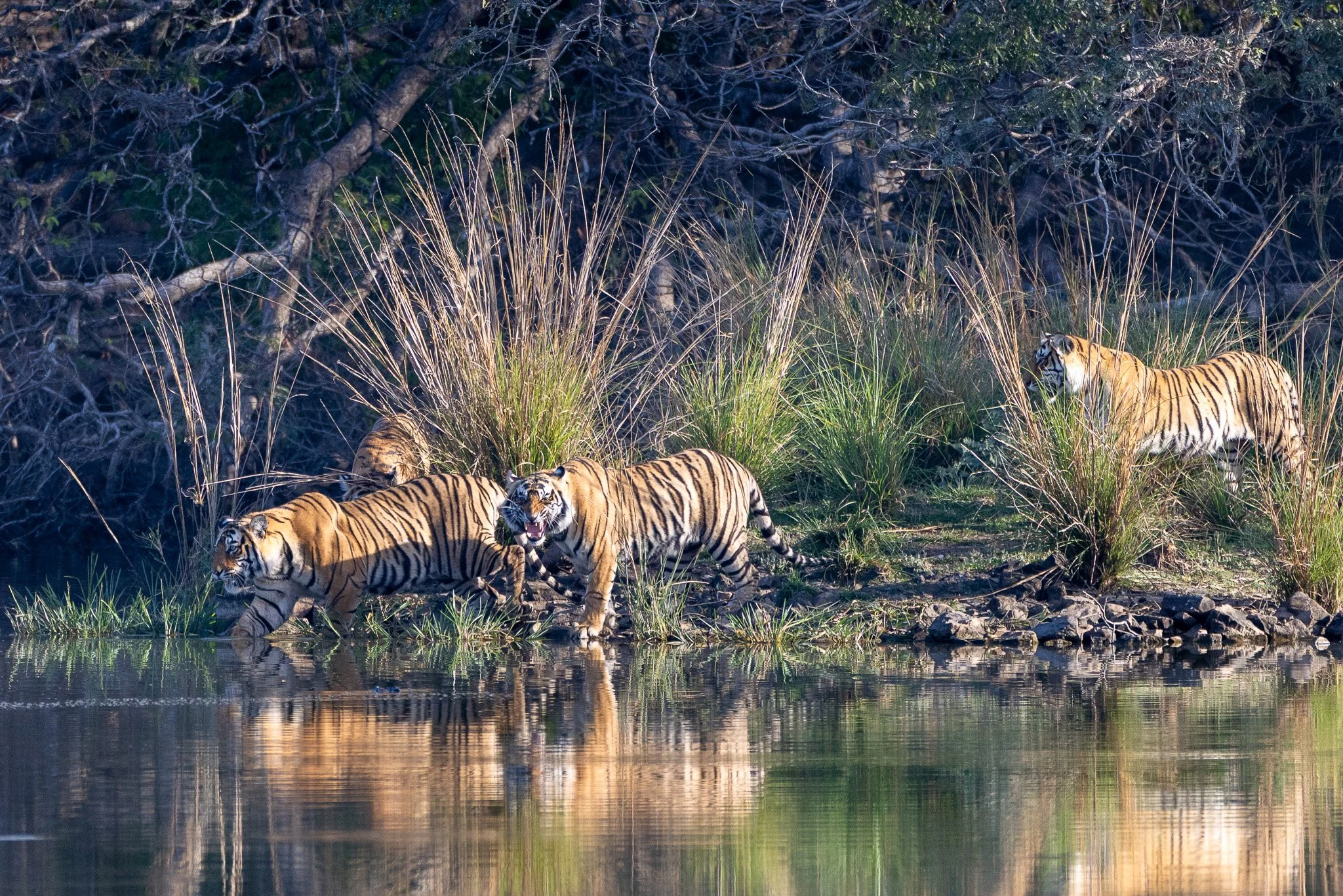 Four Bengal tigers walking along a shoreline near water, surrounded by tall grasses and trees in a natural habitat.