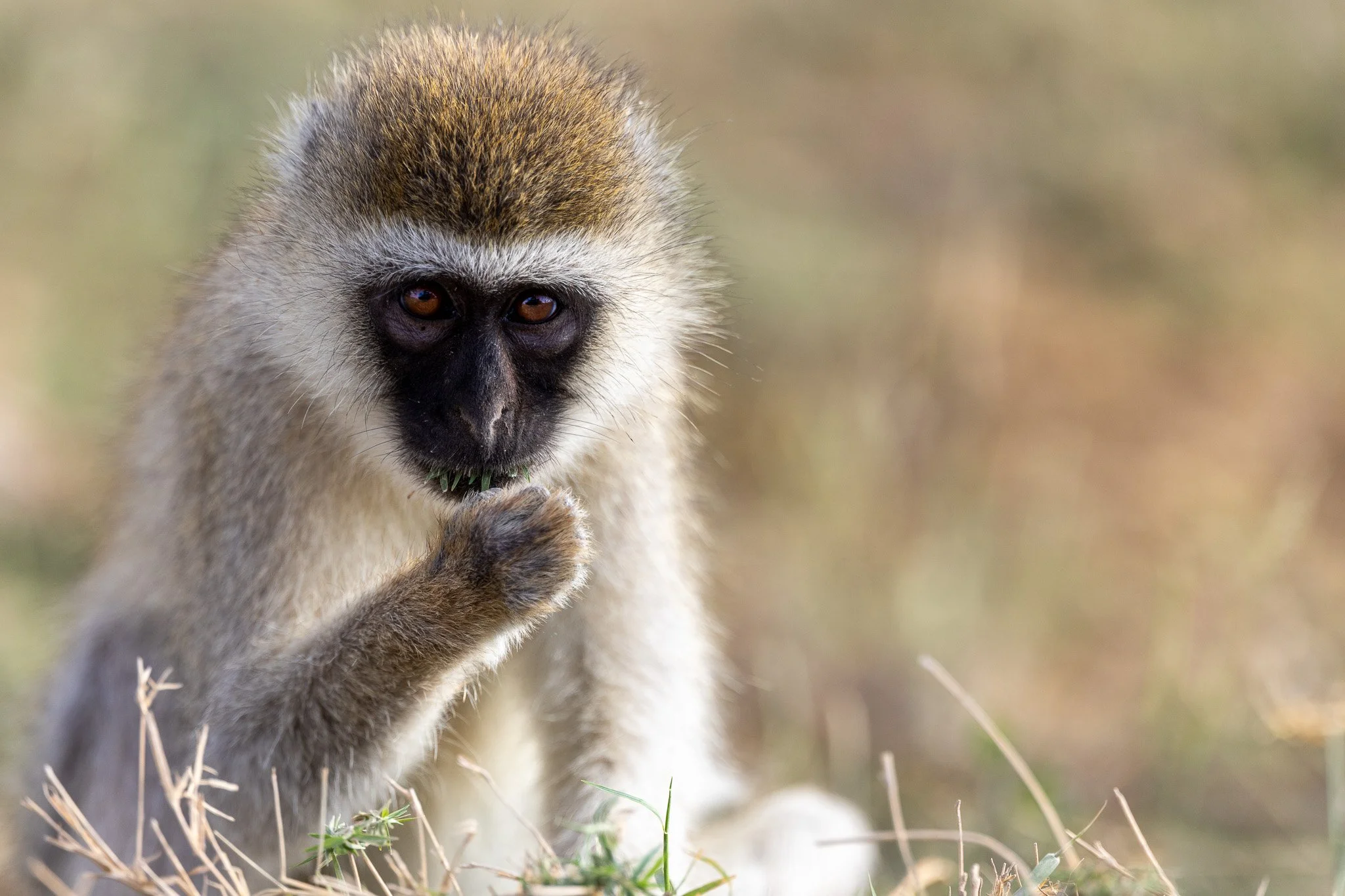 Close-up of a young monkey with dark face, brown eyes, and light-colored fur, holding its hand near its mouth in a grassy outdoor setting.