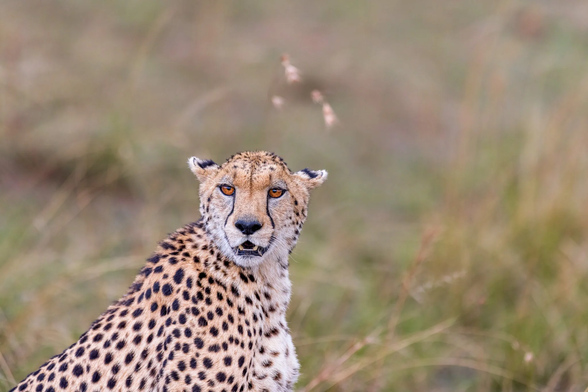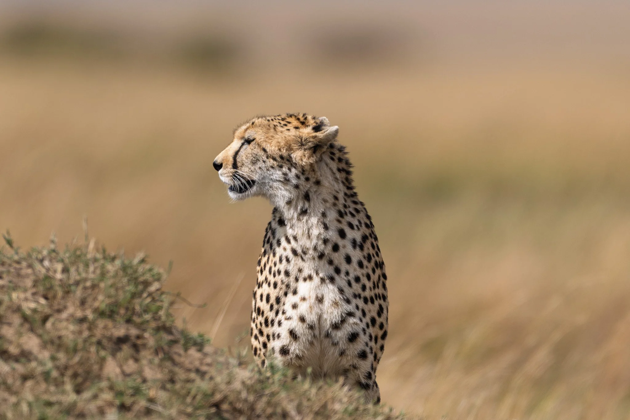 A cheetah sitting on grassy terrain with eyes closed against a blurred, beige background.
