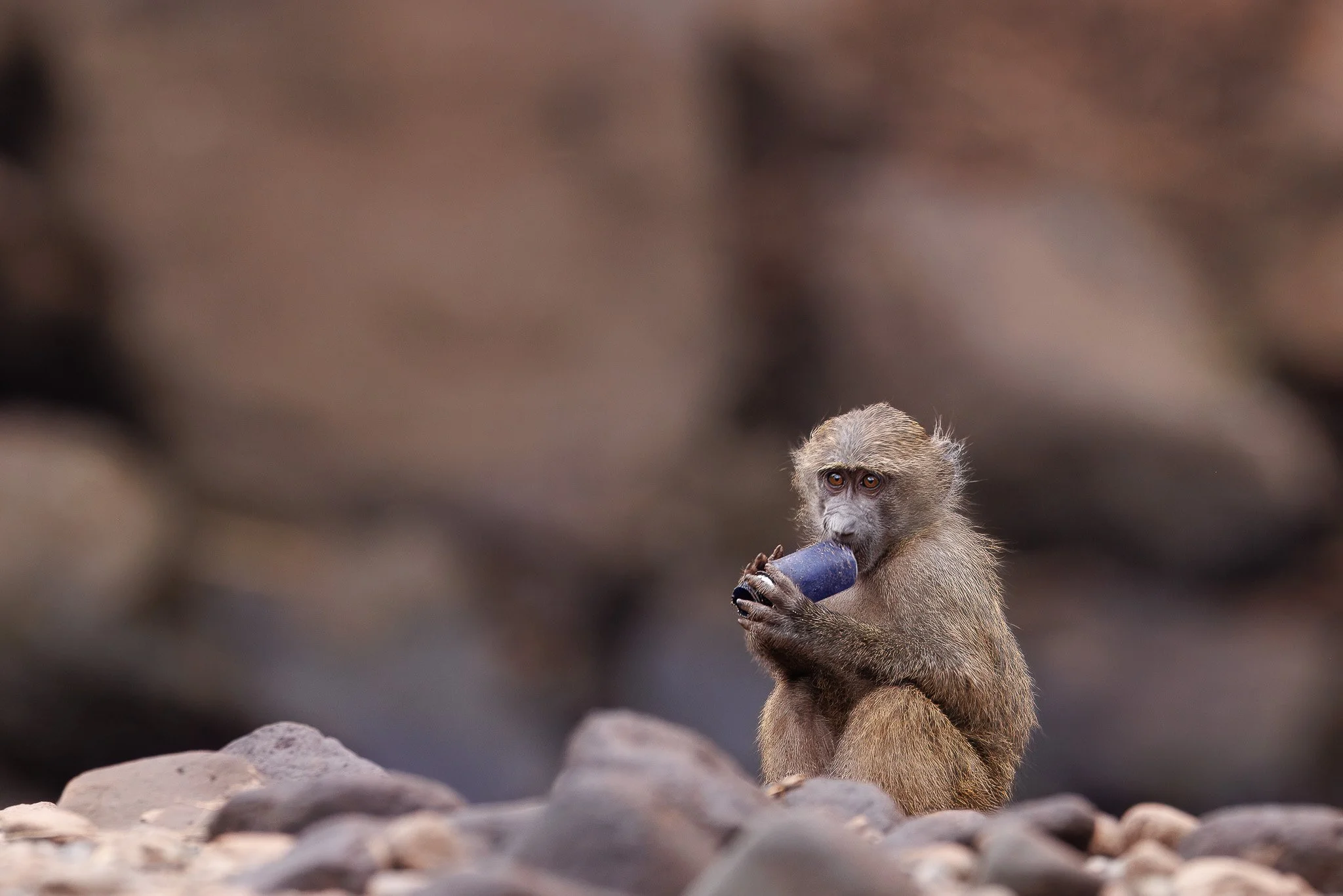A young baboon sitting on rocks, holding and eating a blue food container with a focused expression.