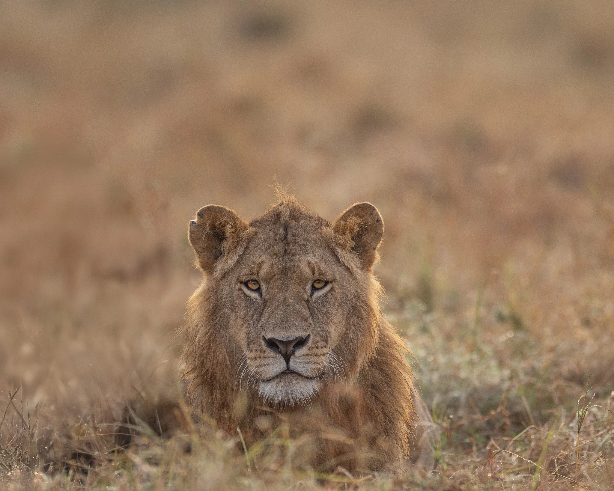 A lion resting in dry grassland, facing forward with golden eyes and a calm expression.