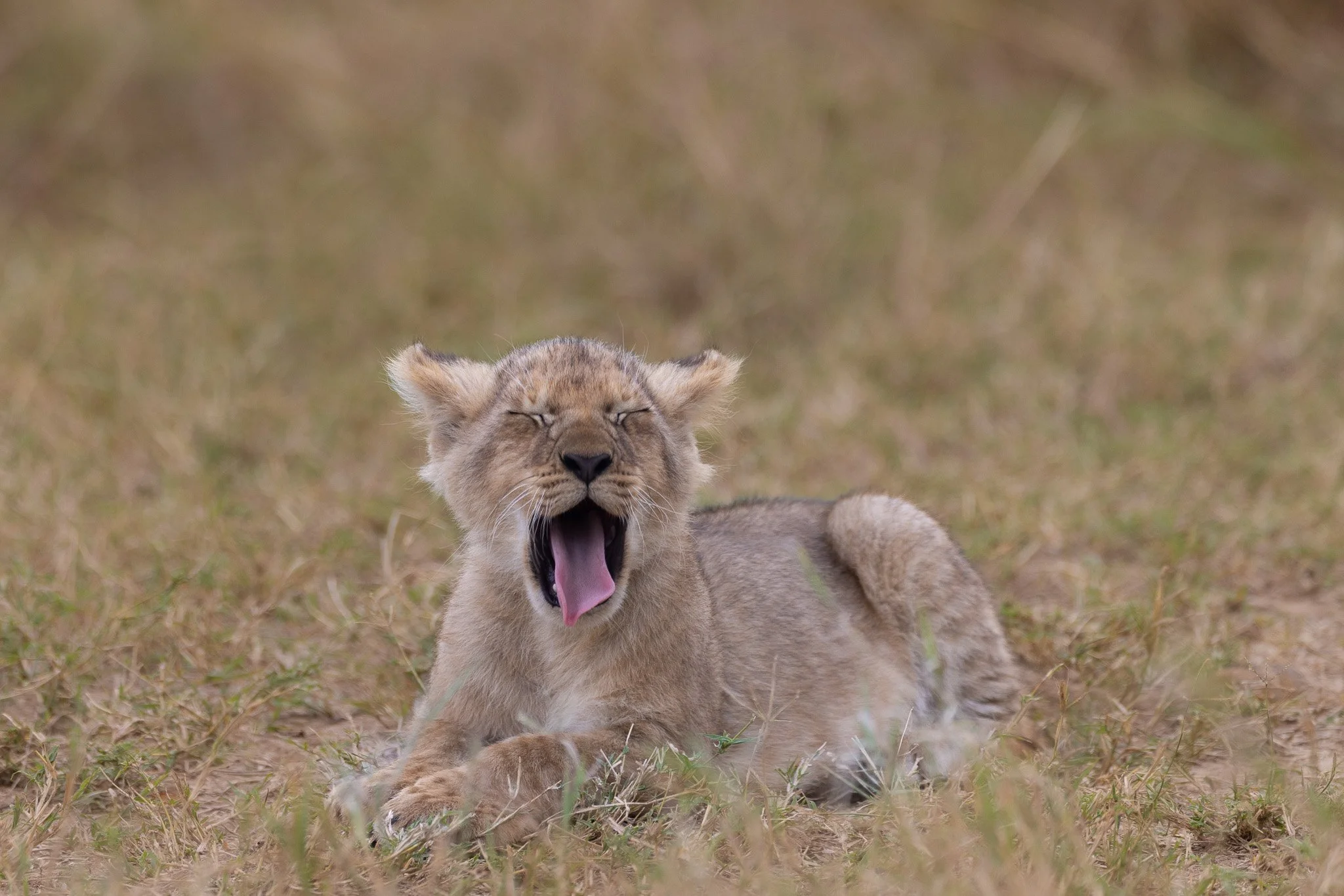A young lion cub yawning while lying on dry grass in a savannah landscape.