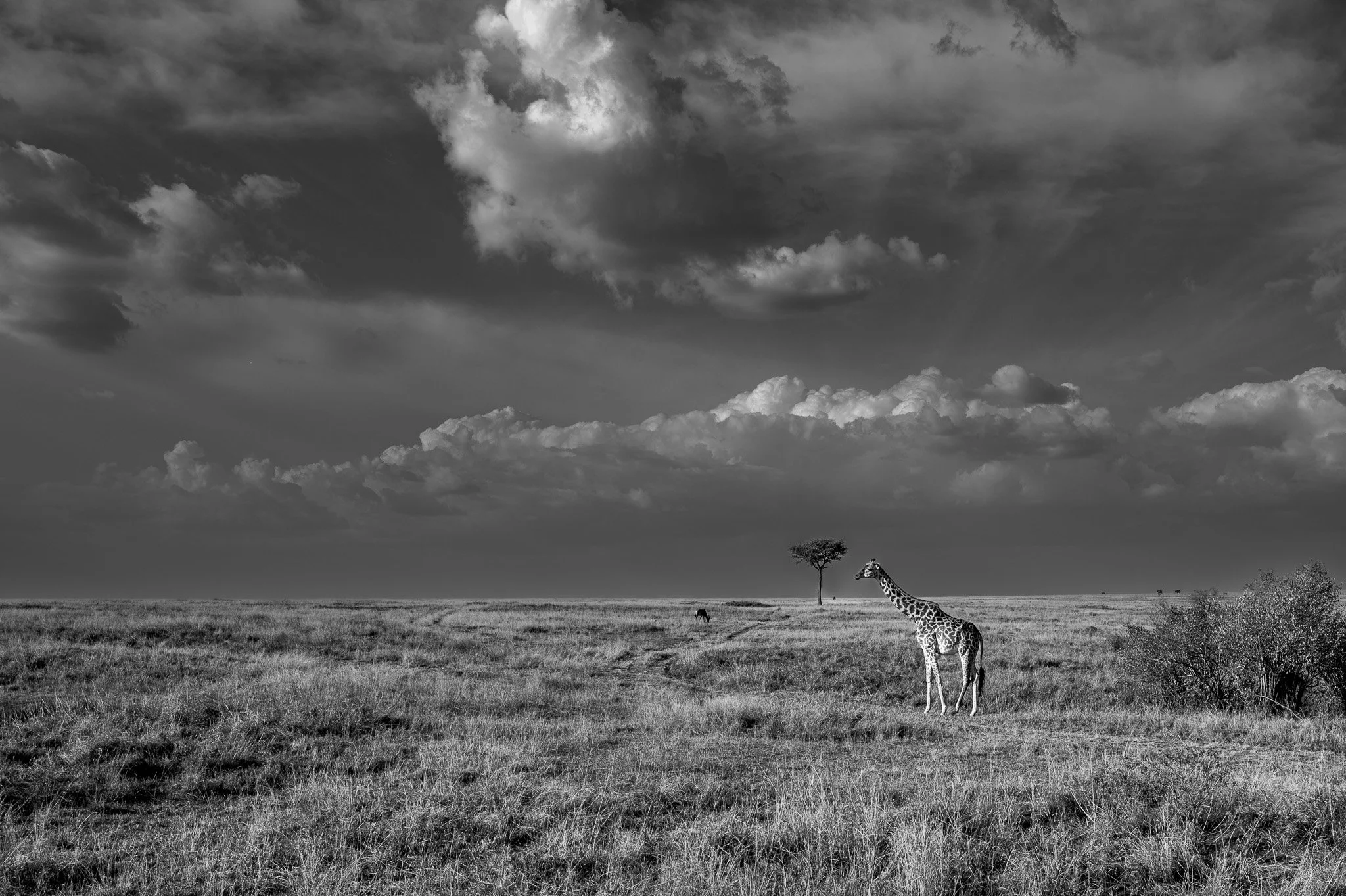 Black and white photo of a vast savannah landscape with a giraffe in the foreground, a tree in the middle distance, and cloudy sky overhead.